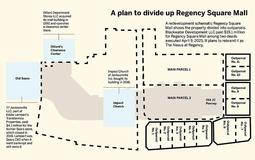 Blackwater Development LLC’s $19.1 million acquisition of Regency Square Mall comprises the property that excludes Impact Church, the Dillard’s Clearance Center and the closed Sears store.