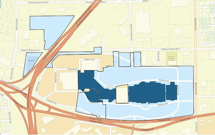 The mall property generally is, clockwise, bounded by Regency Square Boulevard to the north, Monument Road to the east, Arlington Expressway / Atlantic Boulevard to the south and Southside Connector to the west.